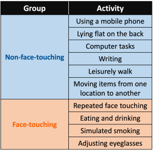 We selected 10 everyday activities (Table 1) including several that should be easy to distinguish from face touching and several that should be more challenging. We recruited 10 participants and asked them to perform each activity repeatedly for 3 minutes at their own pace while wearing a Samsung smartwatch.