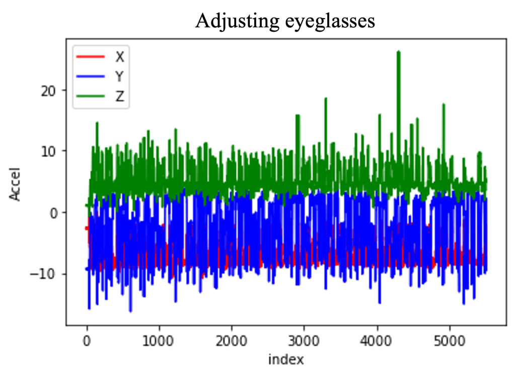 We tested the DTW-based classifier in a user-dependent scenario, in which training and test sets are drawn from the same user (i.e., best-case accuracy), and in a user-independent scenario, in which a set of users are used for training while an additional user is used for testing. Our results showed that recognizing each activity individually (i.e., multiclass classification) is challenging (i.e., 92.48% for the user-dependent scenario and 55.1% for the user-independent scenario). However, our DTW-based classifier can distinguish between face-touching and non-face-touching activities in general with satisfactory accuracies (i.e., 99.07% for the user-dependent scenario and 85.13% for the user-independent scenario). Table 2 shows the confusion matrix in the user-dependent scenario. The “using mobile phone” and “writing” tasks were recognized with accuracies over 99%. However, “adjusting eyeglasses” was recognized with the lowest accuracy of 78.36% and was mainly confused with “repeated face touching”. Regarding the face-touching (red text) and non-face-touching (black text) categories shown in Table 2, there were more within-category confusions than between-category confusions, especially among the activities in the face-touching category.