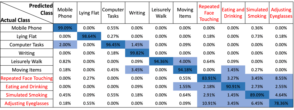 Table 2: Confusion matrix of individual activity recognition in the user-dependent scenario. Face-touching activities are colored in red. The matrix elements highlighted with deep blue indicate correct classifications while the elements highlighted with light blue indicate relatively high rates of confusions (i.e., larger than 1.00%).